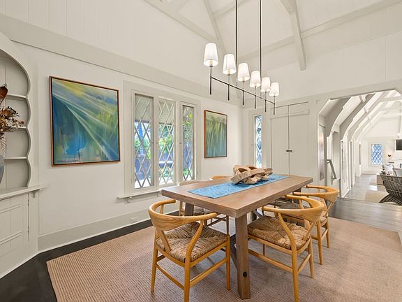 This French Norman Tudor Cottage offers an interior that is as stunning as its exterior, with intricate design details and inviting spaces that evoke warmth and relaxation. Local award-winning designer Philpotts Interiors outfitted the home, blending and highlighting the historic and modern features seamlessly. Architectural features such as high-pitched roofs, exposed beams, and diamond-pane casement windows define the home's character, while variations in floor level create distinct living zones, adding charm and depth to the design. Cozy nooks throughout the home invite guests to unwind, while the layout ensures privacy and comfort in every corner.