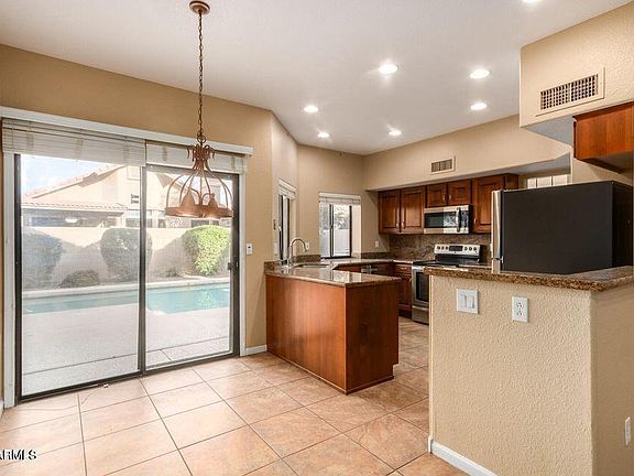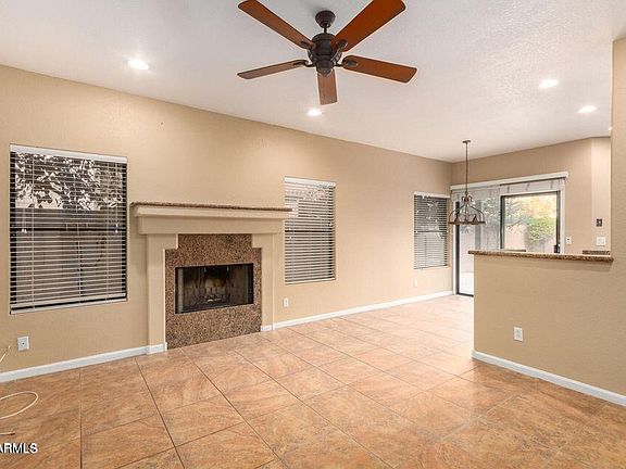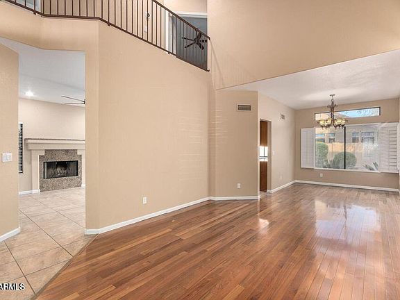 This beautiful property is in the perfect location. Spotless interior comes with beautiful wood floors, high vaulted ceilings, luxurious light fixtures & plantation shutters. Gather around the fireplace on chilly AZ nights. The eat-in kitchen is a cook's delight w/SS appliances, plenty of cabinet space, granite counters, & breakfast bar. Continue onto the main bedroom to find a double-door entry & lavish bathroom w/dual sinks, separate tub & a walk-in closet. The garage comes w/built-in cabinets. Entertain your guests in this lovely backyard w/covered patio & sparkling blue pool. A large grassy park area with community pool & spa right the street. Close to Intel and Desert Breeze Park. HOA fee covers front yard landscaping. Washer, dryer and refrigerator.