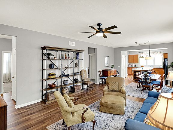 Easy living charming 55+ (Del Webb community). 3 bedroom 2 bath home is ready for you to move right in. Covered front porch leads you to nice entryway where you will step inside to a very well maintained open-concept floor plan. Spacious gathering room opens to dining area, and beautiful kitchen. Kitchen has an abundance of cabinets, counter space, huge island with breakfast bar, stainless appliances and food pantry. Enjoy relaxing meals in dining area. Just off the kitchen is a bright sunroom perfect for morning coffee or evening relaxation. Step outside on your large open patio with tree lined lot, patio becomes covered by just rolling out the patio awning. Flexible 3rd Bedroom can be den or home office. Primary suite includes double vanity sinks, walk-in shower, and walk-in closet. 2nd bedroom and Main Bath. Extra large 2-Car Garage with space for storage. ADT Security alarm. Wired Smart Home. HOA / Lifestyle Activities Director. Vandalia Walking/Bike Trail. Make this home yours.