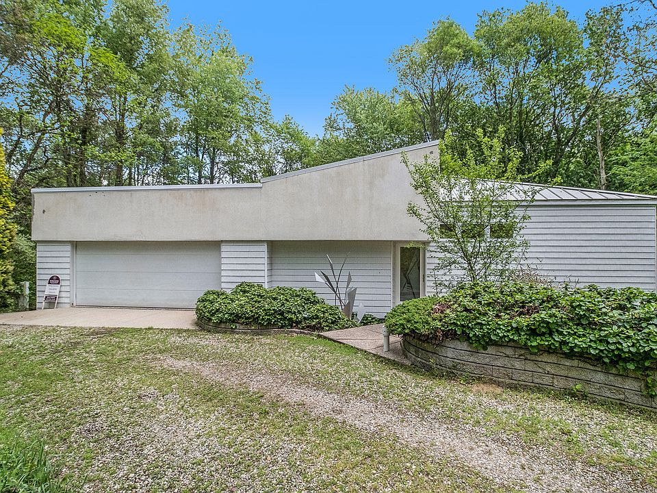 Architect,/Artist designed one owner home. Contemporary home with a great use of windows to enjoy the private setting planted with naturalized gardens . A bi-level design, offers kitchen, main floor laundry, spacious dining room and bedroom suite up and a family room and bedroom suite down. Energy efficient, heated floors, with central air circulation built into the walls designed to be energy efficient
