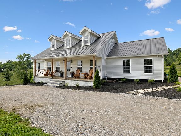Live the TN Dream in this Amazing, Renovated, Basement home on approx 54 acres with incredible front porch views! 3 Bedrooms with an additional room with closet- serves as a 4th Bedroom on the main! Most everything is New- Vaulted living room - Fireplace w/ beams, new flooring, redesigned mudroom with coffee filler, Updated bathrooms and plumbing fixtures, new light fixtures. Primary suite with West Elm quartz vanity in ensuite bath. 27 Ft raised patio overlooking scenic views. Gardens and greenhouse! Finished Lower level, spacious recreation room, full bath w/ dual sinks, walk-in laundry, dedicated office/additional room, storage area. New HVAC in lower level. Abundant wildlife, fenced in pond for animals/livestock. Trails for riding atv, camping, hunting. This farm has privacy yet in a convenient location and includes an older barn and grain bins. Great mix of open space, trees and rolling hills! Fiberoptic internet!