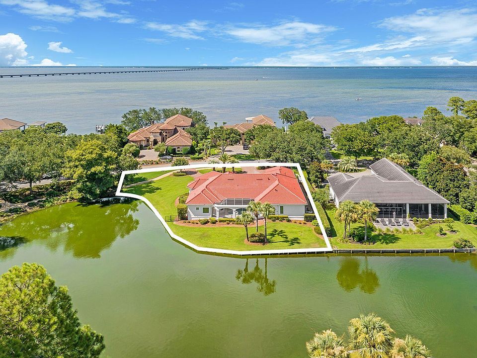 Presiding over a lakefront lot of almost a half-acre, this magnificent Mediterranean-style home has many enviable features and updates. Beautifully architected on the outside, the home revels in its waterfront position with stunning views from most rooms in the house. The broad brick-paved driveway sweeps up to the three-car garage with ample space to accommodate cars and a golf cart. Shallow steps lead up to the imposing front entrance, with tall columns making a grand first impression. Leonardo travertine tile leads to the double door entrance, which opens into the first of two spacious living areas. Brazilian hardwood flooring graces each area, including the open chef's kitchen, which enjoys impressive views. Custom cabinetry, granite countertops, and stainless steel appliances make this a well-appointed space. Keen cooks will note the six-burner gas range/oven, dishwasher, wine cooler, and a pantry for storing additional items neatly out of sight. There's a breakfast bar as well as a dedicated breakfast nook for starting each day with the best views. Designed for entertaining, the kitchen opens into a family room with a fireplace, providing a cozy ambiance. This irregular-shaped room looks out directly onto the screened pool and spa, which in turn overlooks the peaceful lake. All on one level, the home flows through a series of dedicated spaces, including a sitting room, an executive study, a private sauna, and a laundry room. The formal dining room is illuminated by a breathtaking chandelier, making a grand statement all its own. Decorative tray ceilings with recessed lighting are bordered by elegant crown molding, while high ceilings and custom plantation shutters add a high-end finish. Three bright and airy bedrooms each have their own private bathroom, with a further half bath serving guests. The master suite outshines the rest with a sitting area for relaxing, a huge walk-in custom closet, and direct access to the lanai. The generous master bath features decorative lighting, a cultured marble shower, double vanities and a separate make-up area. The jetted tub is perfect for relaxing in this spa-like retreat, which includes a spacious dressing area. A new tile roof (2025), newer HVAC and water heater, and a recently resurfaced pool ensure many years of maintenance-free living. Tinted windows and three independently controlled zones for heat and air deliver the ultimate year-round comfort. Located in the premier non-rental community of Regatta Bay in Destin, this outstanding residence has the added assurance of gated security. High-end amenities include an 18-hole championship golf course, tennis courts, a gym, clubhouse, and a community pool. All this, just minutes from Destin Executive Airport, designer shopping, restaurants, fishing, and beautiful sandy beaches. Sold with golf cart.