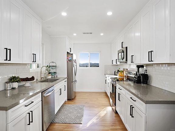Beautifully Renovated 2bed/2bath home located in the heart of Escondido! Located on a large lot, on a quiet street, at the end of the cul da sac, This home has beautiful views and features a spacious and open floor plan, new luxury vinyl plank flooring, shaker style cabinets, quartz countertops, stainless steel appliances and farm house sink with a versatile pull down goose neck faucet. The detached garage and/or BIG Backyard are perfect for an ADU or Granny Flat, garden, relaxing in the shade or watching the sunset. Easy access to the freeways and only a couple minutes to Jimbos, Trader Joes, restaurants, shops and much more this property is a must see!