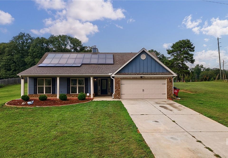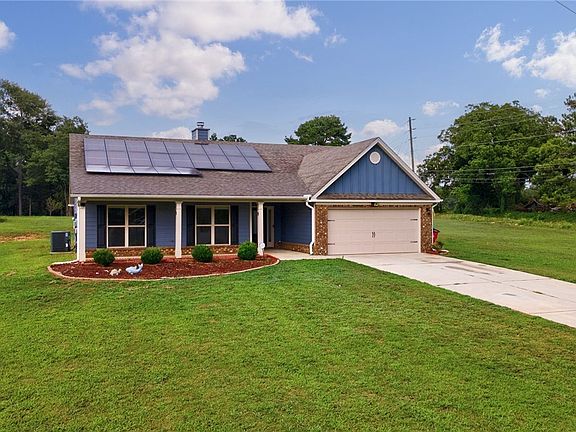 Just over an acre with no HOA in sight, this 4 bedroom, 2.5 bath ranch-style home brings main-level living and room to spread out together. Walking in, you'll be immediately welcomed into an open concept floor plan making it easy to host friends and family. The focal point of the living room is the wood burning fire place along with the high vaulted ceilings. In the kitchen, you have stainless steel appliances, a large island that is perfect for sitting and eating a quick breakfast meal, a walk-in pantry, and granite countertops throughout. Off the kitchen is a dining space that also leads to the back patio. There is a formal living room that would make a great office space. Down the hall, you have the laundry room and all the bedrooms. The primary bedroom with trey ceilings is spacious and has an en-suite bathroom with double vanities, a separate shower & tub, and a walk-in closet. Outside, you have over an acre to let pets roam free, garden, or create the backyard of your dreams. The installed solar panel system also adds long term value! This one is worth your time. Schedule a showing today! Seller is willing to pay 5K closing cost with acceptable offer. This is also a VA Assumable Loan. Seller says bring offers!