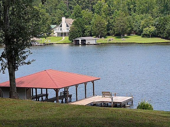 Deep water dock is in place with 2 covered boat slips, jet ski lift, lockable storage, lakeside deck and boardwalk access.