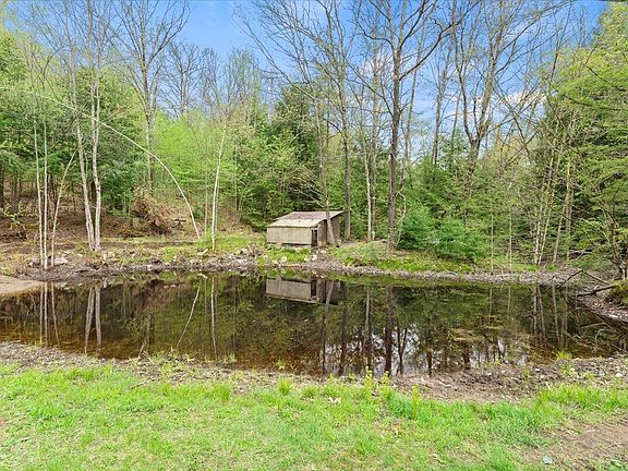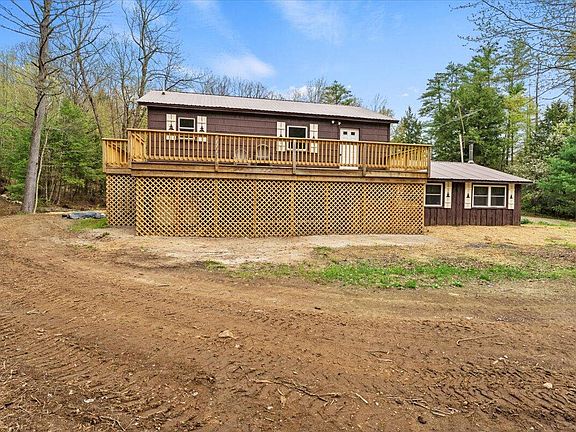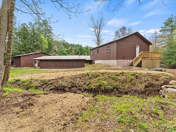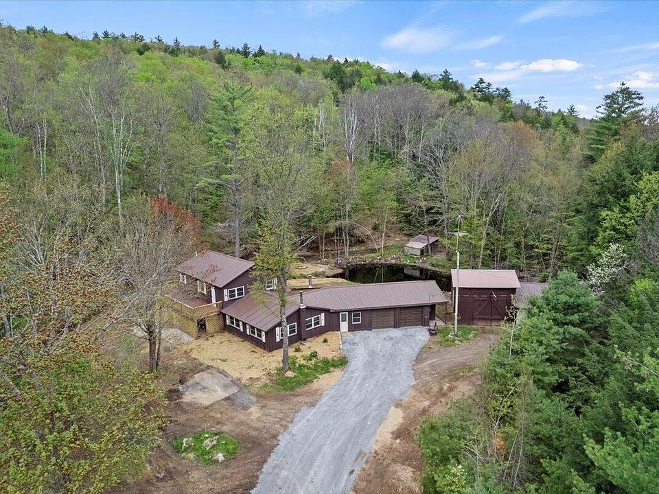 Rehabbed in 2023/24, offering large mudroom, open floor plan in kitchen/living room featuring vaulted pine ceiling with cedar log trim, new kitchen appliances, large walk in pantry off kitchen, den could be used as fourth bedroom, lots of pine and wood throughout, attached two car garage and second garage/barn, small pond. Located on 42 acres with trails throughout and under 5 minutes to I-87, close to Loon Lake beach and Gore Mt. - agent owned.