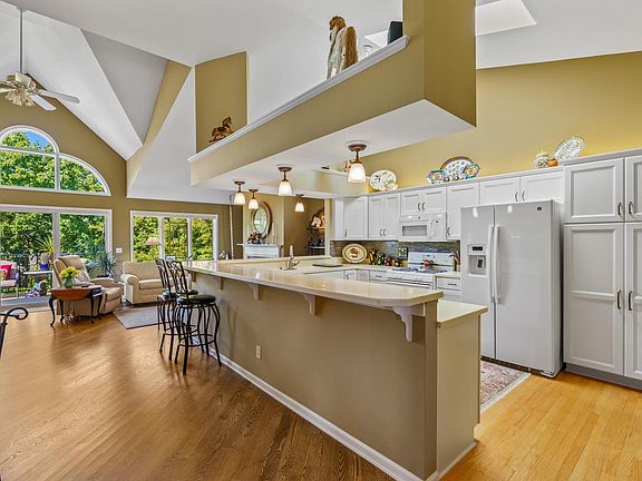 Serene wooded backdropScenic woodland viewsSpacious kitchenVaulted ceilingsAbundant natural lightCozy fireplaceHardwood floors
