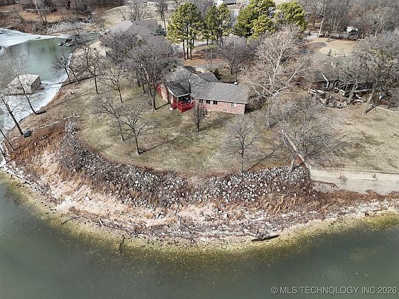Lakefront homes like this rarely hit the open market! This incredible custom-built Lake Hudson waterfront home is perfectly positioned on Morgan Point, offering 341 feet of shoreline, breathtaking 180-degree water views, deep water, partial cove frontage, and a gentle walk to a natural rock beach. Designed to maximize lake views, the spacious kitchen features a large island, Jenn-Air cooktop, and Sub-Zero refrigerator, opening seamlessly to a generous living and dining area with a cozy wood-burning fireplace. The expansive game room showcases a wall of windows with unobstructed lake views—ideal for entertaining or relaxing. A private guest wing includes two bedrooms and a full bath, while the primary suite offers a large walk-in closet and private patio wired for a hot tub. Additional highlights include an oversized utility room, detached garage with loft, and energy-efficient geothermal HVAC. A rare opportunity for premier lakefront living on Lake Hudson.