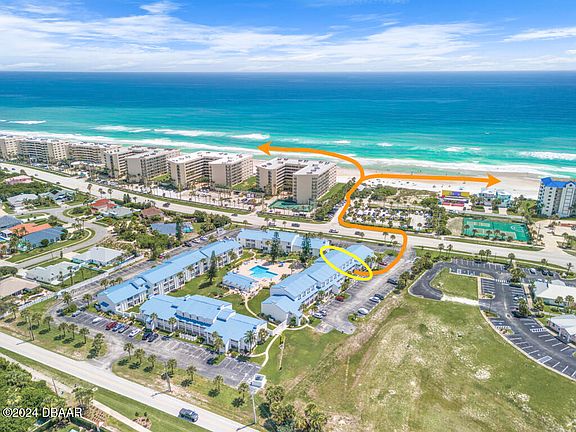 This partially furnished and well-maintained AWESOME BEACHSIDE RETREAT in sought after Ponce Inlet boasts 2 Bedrooms & 2.5 baths and is located across from the pristine ''no drive'' sugar sand beach!! Directly across from popular Winter Haven Park where you can enjoy beach time with the convenience of picnic tables, bathrooms & showers!! This fabulous beachside condo overlooks the sparkling pool & courtyard area and features TWO LARGE EN-SUITE BEDROOMS each with ample closet space! The main level has Porcelain tile and LVP flooring wich is perfect for beachside living! The spacious great room has sliding doors to the inviting enclosed balcony with bar seating and a private laundry area with washer/dryer included. The fully-equipped kitchen has coastal cabinetry and a convenient breakfast bar. There's also a half bath on the main level. Upstairs the main en-suite bedroom has an updated bathroom with a jetted tub & separate stall shower. The second en-suite is also spacious with a good sized closet and tub/shower combination in the bathroom. There's even a pull down attic with ample storage space! Perfect for primary residence, second home or investment property. PET FRIENDLY with NO WEIGHT LIMIT! Community pool is one of the LARGEST POOLS IN PONCE INLET! Low maintenance fee includes building grounds maintenance, buiding insurance, water, sewer, trash, pest control, high speed Internet and cable TV. Walk or bike to waterfront restaurants (with entertainment), the historic Ponce Inlet Lighthouse & Jetty Park, Marine Science Center, pickleball courts, charter fishing, marinas, parks with nature trails, fishing pier, dog park/beach and much more!! Hear the sounds of the surf and smell the salt air!! Enjoy Florida coastal living at it's finest!!