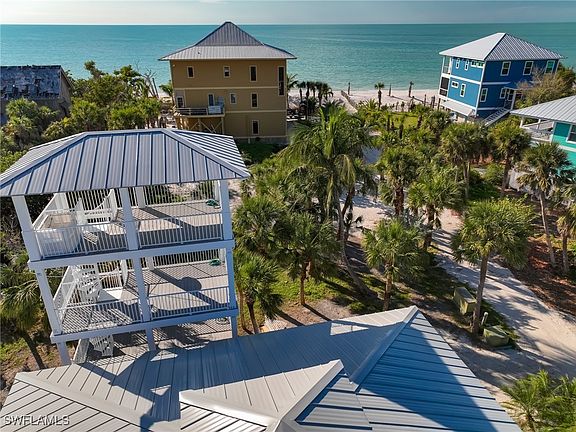 An Extremely Special Combination of Location, Privacy, and a Spectacularly Designed Home! Just steps from the beach and backing up to conservation land to the south. With a meandering floorplan, this home offers so much space, melding together tall ceiling spaces, light-filled cupolas, and 3 large bedroom suites, each with its own full bath. The great room offers a large covered screen porch area, soaring cathedral ceilings, abundant windows, plus an open-concept kitchen and dining space. The top-level room is large enough for the whole family to gather, enjoy sunset toasts at the wet bar, and gaze out to magnificent North Captiva Sunsets. That room could also be utilized as an incredible office or 4th king-sized sleeping space. The outdoor living space is maximized with the additional three-story attached lookout tower - one level is for coffee, one for lunch, and one to toast the setting sun. The exterior features mostly impact windows, new Hardie board siding, and a new standing seam roof. The private enclosed elevator from the ground level lands at a beautiful entry porch outside the front foyer. The backyard has plenty of room for a large pool and entertainment area, with extra privacy bordering land owned by the Sanibel-Captiva Conservation Foundation. This very valuable and rare lot is perfect for building another dream beach home with an incredible view of the water or to keep for private tropical gardens near the sea... the option is available to make an offer on just the house. A Safety Harbor Club membership for shared BOAT DOCKAGE, heated pool, pickleball & tennis courts is also available. For even more privacy, the adjacent view lot to the west on 4601 Oro Pesos Ln is available for an additional $565k.