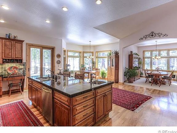 Stunning custom ranch walk-out on 1 acre w/towering pines & views in Perry Park! Open & bright floor plan w/hickory hardwood, knotty alder doors, vaulted ceilings & massive windows w/Hunter Douglas shades. True gourmet kitchen w/granite, island w/veggie sink, Dacor luxury SS appliances including gas cook top & warming drawer, desk space, MASSIVE walk-in pantry, butlers pantry & glazed maple cabinets. Remarkable great room w/floor to ceiling stone encased fireplace, vaulted ceiling & walk-out to low maintenance deck. Luxurious master suite w/walk-out to patio, 2 sided fireplace shared w/spa-like 5 piece master bath w/2 large walk-in closets, jetted tub, travertine floors/counters, shower w/3 shower heads & custom cabinets. Main floor study/office w/hickory hardwood, formal dining, mud room & main floor laundry. Unfinished lower walk-out ready for your custom design. Prof. landscaping w/water feature, fenced yard, covered patio. Only 15 mins to Castle Rock, 35 mins to DTC or CO Springs.