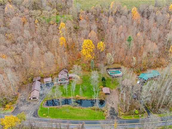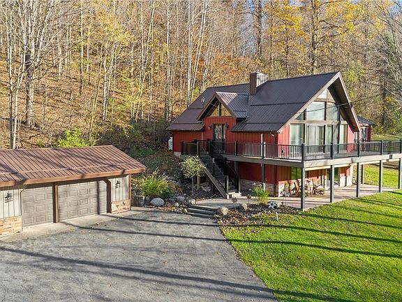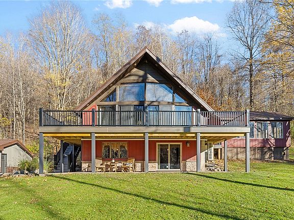 This one owner A-frame home radiates rustic charm with natural wood throughout creating a cozy cabin atmosphere. Nestled on 3.49 acres, This 5 bed, 2 bath custom built home offers unparalleled tranquility, natural beauty and plenty of room for all. The main living area offers an open-concept living area, with its soaring, vaulted ceilings, and invites ample natural light through large windows, enhancing the spacious and airy feel of the home. The finished Lower level offers a family room, kitchenette, first-floor laundry adding convenience to the layout. Modern updates in the kitchen and bathrooms bring a stylish twist to the rustic cabin design. In addition to the main house, the property includes a Timber Tech Wrap around deck, a detached 4 season room surrounded by patio walkways, detached two-car garage, PLUS a large pole barn with extra garage space, storage and workshop space. Enjoy the views of the pond which create a lovely outdoor space for relaxation or entertaining. Roof-2018, HWT-2023, Mini Splits-2022, Everlast Siding-2023 and so much more. This one is a beauty, Don't miss the chance to call this one home.