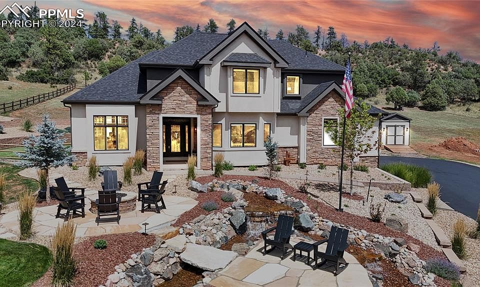 Experience luxury in this beautifully updated Perry Park home. Featuring 5 bedrooms, 5 bathrooms, and approx 4,541 finished square feet on nearly 1 acre, this home boasts a stunning front yard that has recently been meticulously transformed into a serene oasis, showcasing low-maintenance xeriscaping that perfectly complements the natural surroundings. A tranquil doublestream water feature w/charming bridge leads to a cozy seating area centered around a firepit. Inside, the great room features a vaulted cathedral ceiling & custom brick gas fireplace w/wooden mantle. The gourmet kitchen includes granite countertops, elegant cabinetry w/crown molding, and stainless steel appliances, including a gas cooktop. Enjoy the spacious covered deck & bright breakfast nook with bay window views. The main level also features a home office with French doors and engineered wood flooring. Upstairs, the primary bedroom offers engineered wood flooring, a bay window seating area, and an en-suite bathroom featuring a soaking tub, walk-in shower, dual sinks, and a large walk-in closet. Three additional beds & two full baths complete this level. The lower level includes an add'l bedroom, bathroom, home gym, & family room with an electric fireplace & wet bar. Outdoors, relax on the covered deck with pendant lighting &  access to a large paver patio with a fire pit. The backyard is fully fenced! New roof & exterior paint! Located in one of the most desirable Douglas County Golf communities. Perry Park Golf Course is highly rated & recent winner of the coveted CAGGY award. Not a golfer? Social memberships are available. Perry Park features acres of open space, hiking trails, horse stables, and stunning red rock formations, and is just 5 minutes from Sandstone Ranch Open Space and Trails. Secluded but not isolated, only 20 mins to Castle Rock and 40 mins to DTC or COSprings.