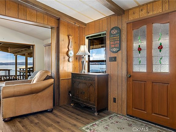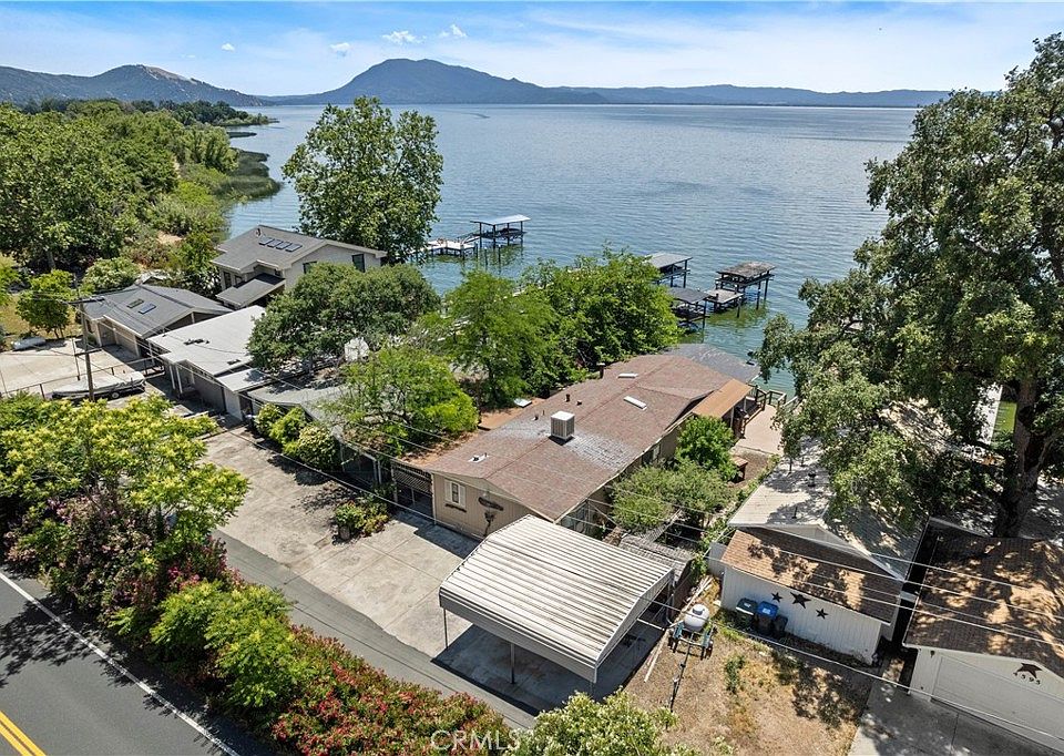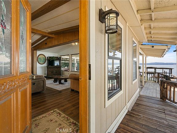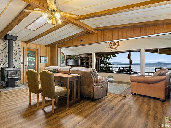 The Lake Escape! The perfect spot to get away on 50 feet of lakefront with pier and boat lift. Spacious 2 bedroom, 2 bath home has laminate flooring, freestanding wood stove, vaulted ceilings, laundry room, and a living room wall of windows with lake and mountain views. Extra space in primary bedroom could be separated to make a 3rd bedroom. Large carport, storage area, shed and paved driveway. But the best part is the covered, lake front deck and pier with covered patio and boat lift. A summertime fun spot!