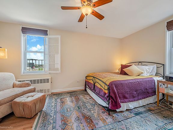 Lovely spacious top (6th) floor 1-bedroom in a very well maintained 1960s elevator building. The apartment features beautiful hardwood floors in the living room/dining area and the bedroom with open views of NYC, LIC and Astoria. This corner unit with north and east exposure features an updated windowed galley kitchen with ample cabinets, 4 generous single closets and a double closet in the bedroom. There are 2 inwall ACs - one in the living room and the other in the bedroom.