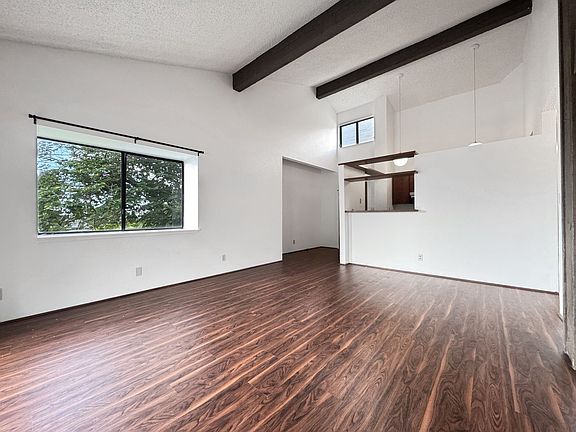 The recently painted three-bedroom, two-bathroom townhouse has easy to clean vinyl plank flooring, stainless steel appliances, a one-car garage, and one open parking space.