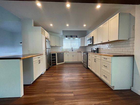 Bay window seatingAdditional storage spaceHigh vaulted ceilingsStainless steel appliancesButcher block counter topsFarmhouse sinkSoft close cabinets