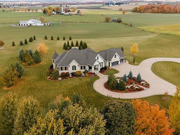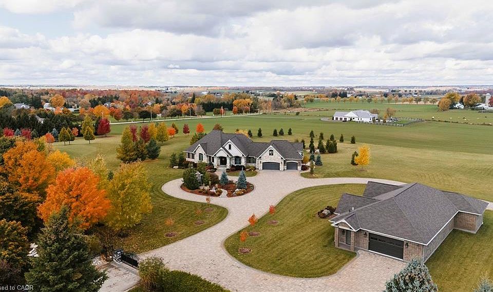 A rare offering in the prestigious countryside of St. Clements—46 Anita Drive is an 18.28-acre gated luxury estate that elevates refined country living. Beyond the custom iron gates, a 900 ft interlock drive leads to meticulously landscaped grounds revealing a showpiece 12ft granite Inukshuk roundabout. The $1M+ surrounding landscape/hardscape includes spectacular mature gardens and trees, a grand armour stone and granite waterfall cascading into a tranquil pond-crafted for privacy and prestige. Main residence exterior is a complementary blend of brick, stone and stucco spanning 7,325 sf on 3 levels. Radiant in-floor heating and Savant smart home automation throughout including garages. Vaulted ceilings, detailed poplar, oak and maple millwork and handcrafted finishes elevate every space. The home is filled with character and grandeur, featuring a double staircase leading from the upper deck down to the lower patio. At the heart of the home, a designer chef’s kitchen features Gaggenau appliances including range, teppanyaki, charcoal grill, 17 ft Cambria/Caesarstone quartz island, Cambria counters and backsplashes seamlessly flow into the sunlit family room that shares a 3-sided gas fireplace. The primary suite is a private retreat with a spa-like 9-piece ensuite, heated floors, surround sound, serene turret sitting area and boutique-style dressing room. The walk-out lower level is an entertainer’s dream-offering a custom bar, custom natural stone floor-to-ceiling gas fireplace, home theatre, gym & guest rooms. A 3,500 sf heated workshop/coach house with 11 ft ceilings and triple garage doors offers a workshop paradise or auxiliary residence conversion potential. In addition there is also a 2,468 sf steel storage building with custom steel pallet racking for 72 skids completes this extraordinary estate. Has potential for a unique equestrian setup. Fully irrigated around all three building perimeters, zoned A1 Agricultural, and min. to Waterloo and highway access.
