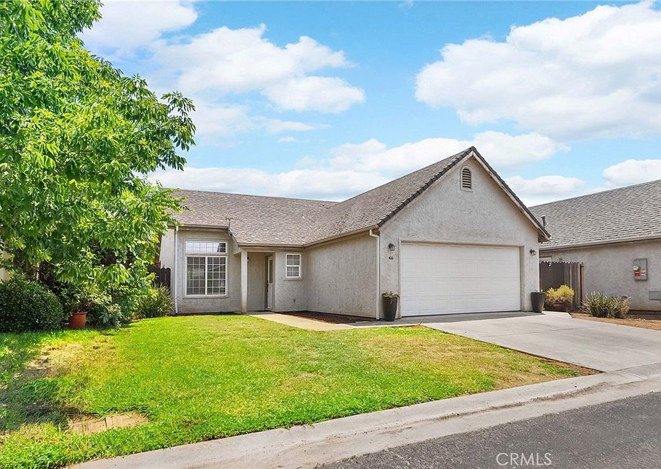 Welcome to 46 Artesia Dr, a move-in-ready charmer tucked at the end of a quiet cul-de-sac in one of Chico's desirable neighborhoods. This 3-bedroom, 2-bathroom home spans 1,233 sq. ft. and offers the perfect blend of comfort, function, and opportunity. Whether you're a first-time homebuyer ready to put down roots or an investor looking for a low-maintenance addition to your portfolio, this one checks all the boxes. Step inside and you're welcomed by a bright, open-concept layout with brand new plush carpet and fresh interior throughout. The living room flows effortlessly into the dining area and kitchen, creating a warm and inviting space for entertaining or everyday life. The kitchen features tile countertops and flooring, a central island with bar-top seating, a gas stove, pantry storage, and an updated chandelier that adds a modern touch. All three bedrooms are located down the main hallway and are well-sized with ceiling fans and great natural light. The hall bathroom is conveniently positioned between them for easy access. At the end of the hall, the primary suite serves as a relaxing retreat with vaulted ceilings, dual closets, a private en-suite bathroom with a walk-in shower, and direct access to the backyard. The indoor laundry room includes hookups and leads directly to the attached 2-car garage. The backyard is a blank canvas, ready for your personal vision! Whether you're dreaming of a garden, outdoor kitchen, or play space, there's plenty of room to make it happen. Two raised garden beds on the side yard are perfect for farm-to-table vegetables, while a fire pit sets the scene for cozy evenings with friends. The covered patio provides a shaded retreat, and the mature shrubs provide added privacy. The newly updated sprinkler system in the front yard helps keep your curb appeal fresh and thriving. Located just minutes from Upper and Lower Bidwell Park, schools, shopping, and dining, this home offers the comfort, location, and lifestyle you've been looking for! Don't miss your chance to own this sweet home in an ideal location; it's ready for you to move in and make it yours!