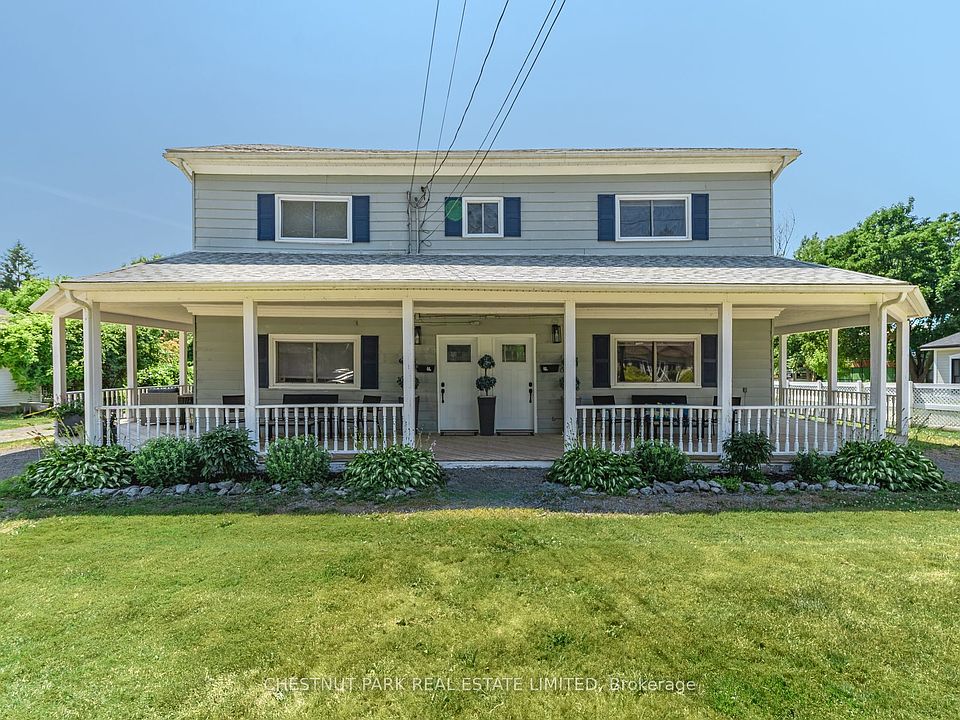 Set along one of Wellingtons most desirable streets, this circa 1840s duplex is a distinctive proposition in the neighbourhood that offers a rare blend of versatility, design, and location in Prince Edward County. Anchored by a deep lot that stretches toward a canopy of green with west facing horizon, the opportunity comprises two self-contained residences, each with their own private driveway and entrances, contemporary finishes, and bright, open interiors tailored for modern-country living. Extensively renovated in 2020, the home features new plumbing, updated electrical panels, flooring throughout, appliances, and new hot water tanks. Additional upgrades include a new roof and, furnace and air conditioning, ensuring comfort. The north side of the abode features a stylish two-bedroom, two-bathroom unit, currently operating as a licensed STA, ideal for generating income through short-term. The other, a well-appointed three-bedroom, two-bathroom suite on the south side, lends itself beautifully to full-time living, extended family, or long term rental investment potential. Both units offer well equipped kitchens, clean-lined bathrooms, and seamless flow to expansive covered wrap around porches made for slow mornings and relaxed evenings. Outside, the oversized yard invites gathering and solitude alike, with ample space for recreation or quiet retreat beneath mature trees. Lots of room to expand with some vision and make it an epic backyard oasis. From this prized location, stroll by foot or bike to Wellingtons celebrated eateries, markets, and galleries, while the Millennium Trail and beach remain only minutes away, offering an effortless connection to everything the Countys Lifestyle is loved for. Whether you're envisioning multi-generational living, co-ownership, or a smart income-producing escape, this property represents a rare opportunity to be creative, live beautifully and intentionally, in a place where every path leads to something extraordinary.