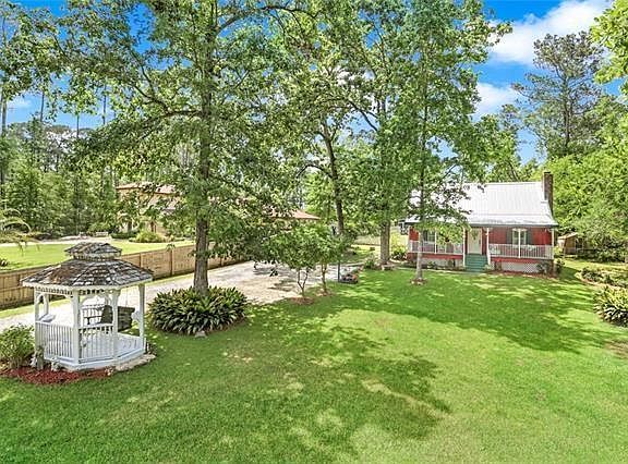 Motivated Sellers - Charming cottage with a brand-new roof, Flood Zone C - the best on a .70-acre lot. Living room with brick fireplace & wood floor. Kitchen has granite counters & stainless appliances including refrigerator. Downstairs primary bedroom, two bedrooms upstairs. Hot tub screened back porch, functional shutters, big, lifted storage shed, greenhouse has electricity, dbl carport Located in gorgeous Flower Estates country feel within minutes of every convenience with neighborhood boat launch & park.