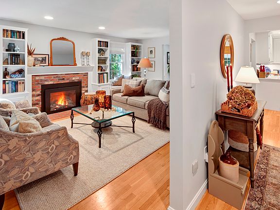 Brick fireplaceFront porchTwo-car garageCozy living spaceHardwood floorsExpansive outdoor spaceBuilt-in bookcases