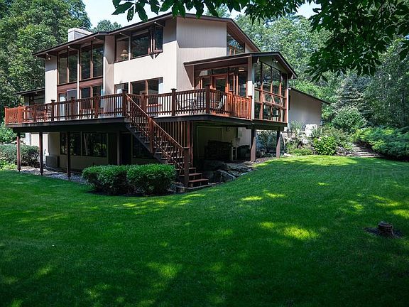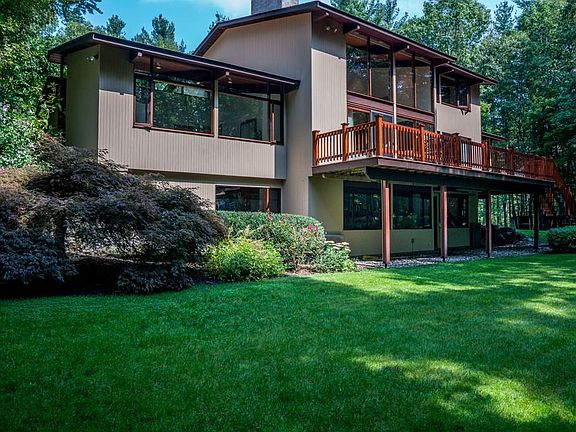 NATURAL ELEGANCE IN A SERENE WOODLAND SETTING - Bring nature indoors through walls of windows made possible by post-and-beam architecture. This Deck House offers exposed beams, soaring ceilings, and rich naturally-finished woods. The level-in foyer leads to an open-concept great room with 2-story chimney, dining room and welcoming, generous kitchen. A stunning first-floor master suite, sunny office, powder & laundry rooms, 3-season porch and 46-ft deck complete this level. Ascend to a loft, 2 more bedrooms and a 3rd bathroom, or descend to a walk-out 33x26 family room with wood stove and exercise, game, and home-theater areas, and a sunny 23x18 wood shop with its own power, air/dust systems and compressor. Relax in 5-zone efficient heating and 2-zone central AC. Enjoy 6.6 private acres of timber and mature, irrigated landscaping with colonial-era rock walls, 2 ponds and a nature trail. Drive 2 mi to Boston commuter coach, 8 mi to broad choices of shopping & dining, or 28 mi to Boston.