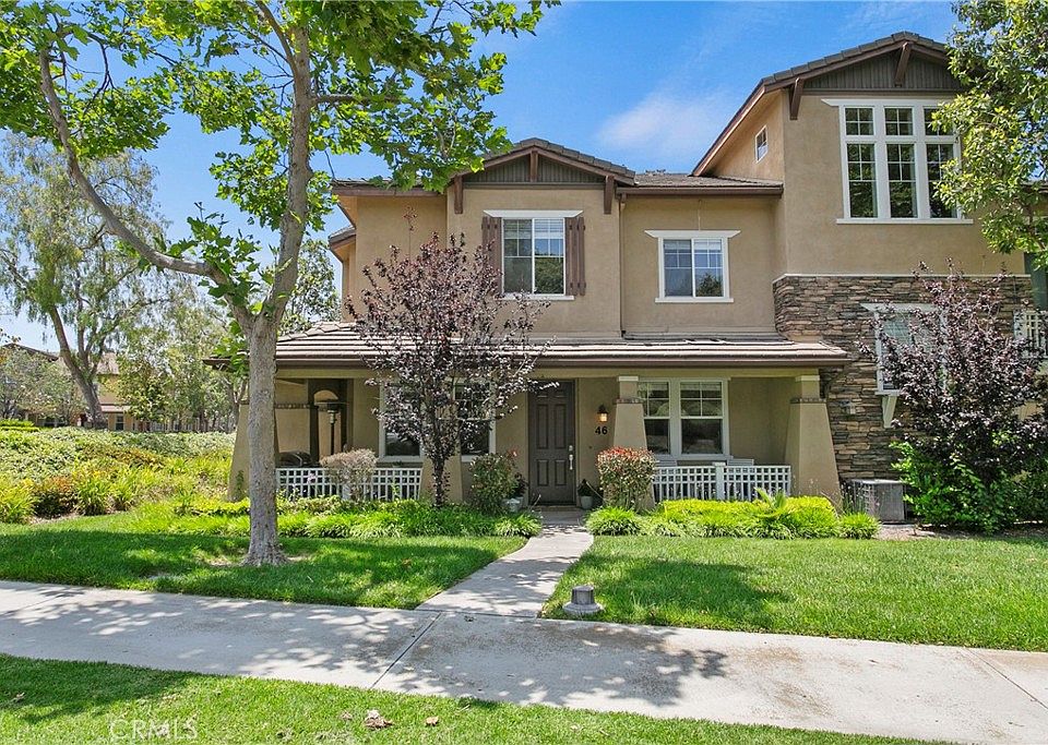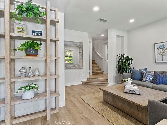 Beautiful End Unit Townhome, Move in Ready! A premium end unit location, recently updated, tons of storage, great light, ideal location with a large front lawn and lots of parking! This beautiful townhome features hardwood laminate flooring, stainless steel appliances, updated kitchen and bathrooms, and an inside laundry room. The floorplan is ideal with a spacious separate living room, a formal dining room, and a beautiful kitchen with stone countertops, custom backsplash, farmhouse sink, and large island open to the family room with fireplace, bar and wine fridge. This home has plenty of storage and space in all the right places. The primary suite is a peaceful retreat with vaulted ceilings, hardwood laminate flooring, a large walk-in closet, and an upgraded master bath featuring his and her stone-topped vanities, custom backsplash, modern sinks and fixtures, as well as elegant tile floors. There are two spacious secondary bedrooms with new carpet and a renovated upstairs bath with all new fixtures. Additional improvements include upgraded wide baseboards, crown molding, and recessed lighting. The home also features an attached direct access 2-car garage with built-in storage. Located in the desirable Chambray community, the home is close to restaurants and shops, walking trails, pools, parks, and more. It offers the Ladera Ranch lifestyle with community and resort-style living with unsurpassed amenities and fantastic A+ schools... Hurry, this home won't last long!