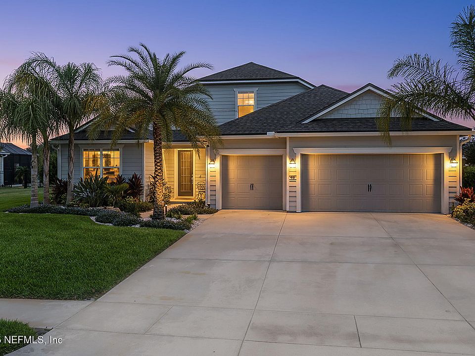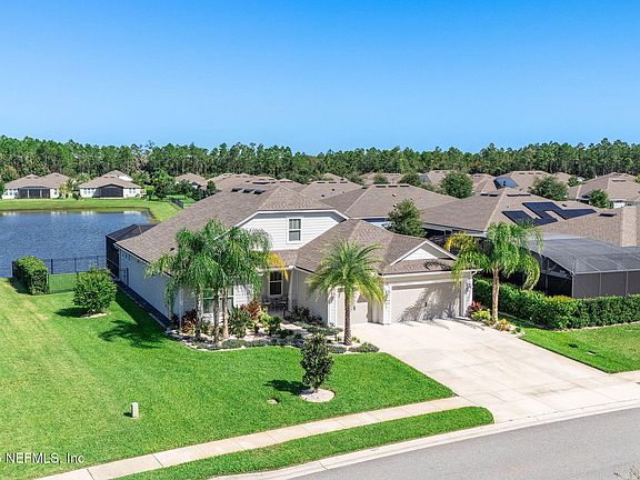 AFTER-MARKET UPGRADES GALORE—better than builder! This 2021 lakefront pool home in gated Del Webb Nocatee (55+) is loaded: screened, heated pool & spa on travertine; premium turf backyard, lush privacy hedges, and upgraded landscaping for true low-maintenance privacy. Bright open plan with NEW LVP up & down. Chef's kitchen: quartz, NEW WOLF gas cooktop, Frigidaire Professional double oven/micro, Bosch 800 DW, SS fridge, large island, and custom-shelved pantry. Triple pocket sliders open to the lanai. Upstairs: loft/media + private guest suite. Main level flex room/office. Custom closet systems, smart-home features, and NEW electrical panel w/ 50-amp generator connection. 3-car epoxy garage w/ storage + golf-cart space. Enjoy the Del Webb lifestyle in Ponte Vedra— home is walking distance to resort pool, fitness, restaurant/bar, pickleball, trails, clubhouse. Minutes drive to the beach and world-class golf at TPC Sawgrass.