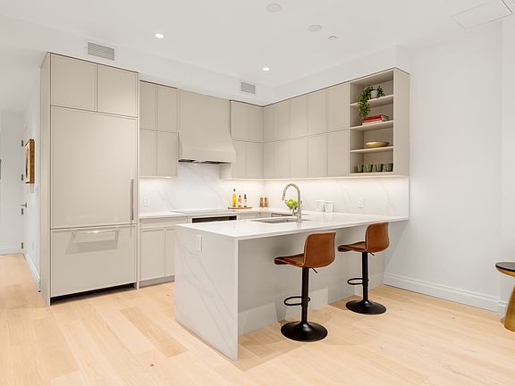 This Floor-Through Residence offers an elevated balance of privacy and light, with direct elevator access opening into grand, sunlit living spaces. Interiors feature white European oak wide plank floors, Calacatta Monaco quartz kitchens with Miele appliances, and luxurious bathrooms with Waterworks fixtures, blending elegance with everyday functionality.
