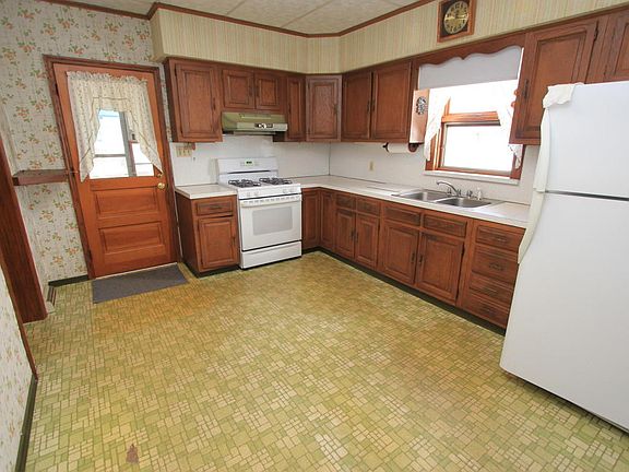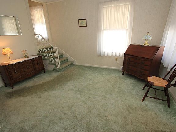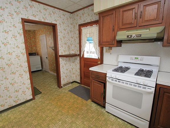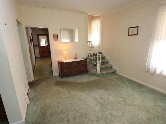 Large 4 bedroom, 2 bath, very open with 9 foot ceilings. Gas forced air heat, clean, dry basement, 1 car detached garage, large lot with side parking in rear as well as driveway,front and back porch. This house can easily be restored to its original splendor with all the charm, original woodwork and hardwoods under the carpet. Roof doesn't currently leak,but will need a new one in the near future