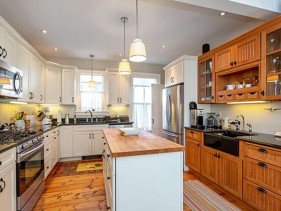Fully restored historic home. Reportedly built in 1878 by a local master craftsman for Samuel Knight and his family. Careful attention to assure maintenance & preservation of many original features. Custom center island kitchen features oak butler's pantry, gas range & original wood flooring. Adjacent breakfast area. Formal Dining room. Office/study. Bright, sunny living room. Well planned first floor guest or master bedroom suite. Original wood flooring and trim details throughout. Upstairs is a versatile study area and three comfortable bedrooms, including another master bedroom with a large walk in closet adjacent to a nicely appointed full bath. All major systems updated including electrical, plumbing, natural gas heating system, windows, roof shingles and insulation. Private deck, large detached two car garage with full loft above. Beautiful grounds with mature trees and a spacious and sundrenched back yard that is ideal for the gardening enthusiast and family fun.