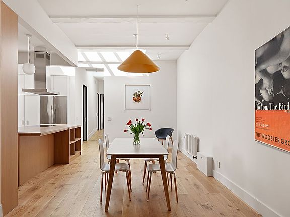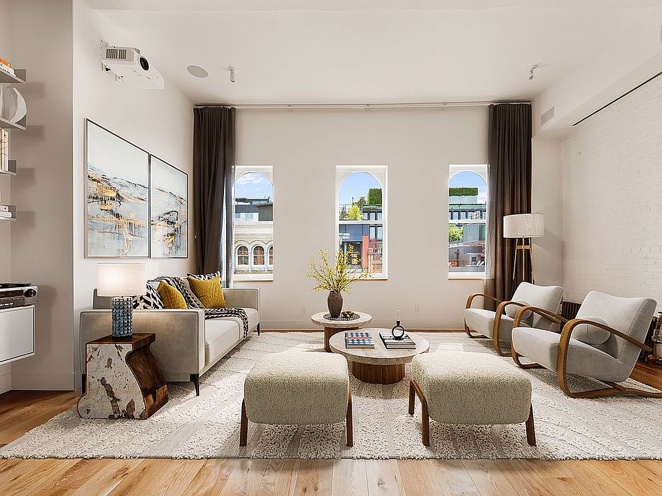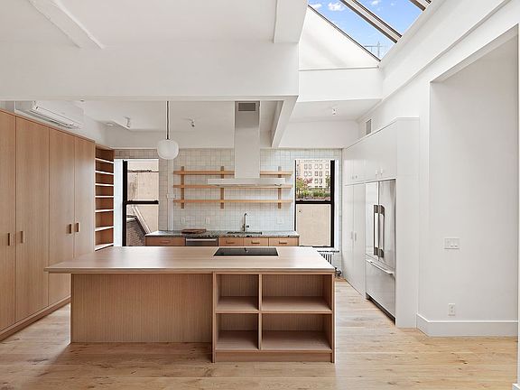 Step off the authentic manual lift to find this gorgeous gut-renovated home with 3 bright exposures, multiple skylights and a sense of peace and tranquility so hard to find in New York City. Enter to an expansive living room with high ceilings, reclaimed wide-board floors and open views of the surrounding landmarked district from a wall of double-glazed arched windows. A projector with remote drop-down screen and surround sound speakers is ideal for watching movies, while endless wall space provides the perfect backdrop for your art and photography collection. Just beyond, you'll find the oversized chef's kitchen and adjacent sky-lit dining area that easily seats 12 guests. Designed for one who loves to cook and entertain, the bright windowed kitchen with center-island is appointed with a full Miele appliance suite and offers abundant custom-milled cabinetry and multiple pantry closets. Nearby, a hallway separates public from private and leads to 3 bedrooms (2 with operable skylights), and two tastefully renovated bathrooms with radiant heated floors and luxurious bronze fittings. The cozy primary bedroom suite is a quiet sanctuary that features a large walk-in closet with double hanging space and built-in bureaus. The primary bathroom is clad in custom tiles and offers a deep soaking tub and copious amounts of storage. Every inch of this impeccable home has been carefully considered with luxury and comfort in mind. Additional amenities include multi-zoned central air-conditioning, a Miele washer-dryer and custom lighting on dimmers throughout. Best of all, is living on the top floor with no one else above you, assuring pin-drop quiet privacy and maximum serenity!