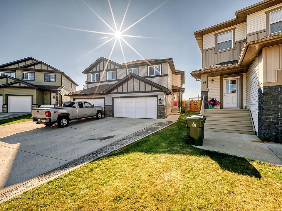 Discover luxurious living in the heart of Harvest Ridge, Spruce Grove. This stunning FULLY FINISHED half duplex merges contemporary design with elevated style across its spacious layout. Nestled on a reverse pie lot, this home seamlessly integrates indoor and outdoor relaxation. This home offers 3+2 beds, 4 baths, airy bonus room upstairs and a fully finished bsmt. The primary bedroom is true paradise and overlooks the backyard oasis; the ensuite has a newly installed modern tiled shower and walk in closet. The home has been well cared for and updated over the years with central AC, bonus room accent wall with electric fireplace and mudroom barn doors. The beautifully finished bsmt has 2 bedrooms and half bath. Step outside to your own private oasis, hot tub, garden beds, composite deck, firepit and backing onto a park area. Laundry is on the upper floor. NEW washer, dryer and dishwasher. Prime location in Harvest Ridge and nestled in a cul-de-sac where tranquil vibes are on the daily.
