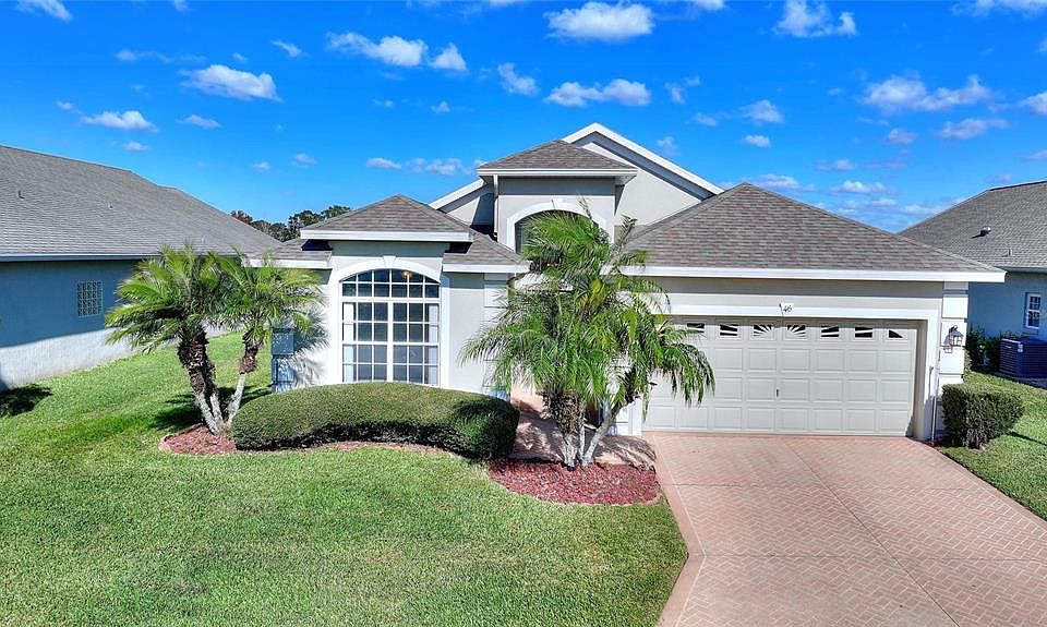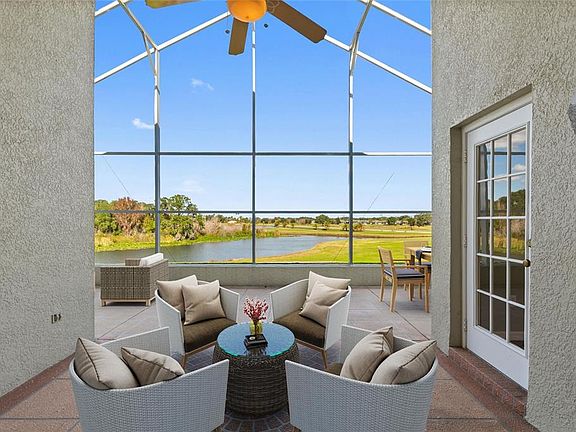 One or more photo(s) has been virtually staged. GOLF COURSE and WATER VIEWS from the Ever-Popular RidgeDale 3/2 model with a 494 SF North-Facing Covered & Screened Lanai overlooking White Heron Golf Club Fairway #14 and located just 0.1 miles from the High Vista 55+ private clubhouse and amenity center. 12 FT ceiling in central Great Room with a wall of patio doors to screened lanai with decorative concrete floor. Eat-in kitchen has granite countertops, built-in desk and breakfast bar with pendant lighting, vaulted ceiling, closet pantry and broom closet. Cathedral ceiling in primary en suite bedroom with walk-in & linen closets and level-entry shower. Split bedroom design offers semi-private guest area with two bedrooms and full bathroom with a linen closet between them. Corridor laundry room to garage has utility sink and closet. Primary bathroom remodeled and water heater replaced in 2025; HVAC replaced 2020; Roof replaced 2015. Full-view leaded-glass front door with matching sidelight. Garage has electric screen, installed off-ceiling storage and pull-down ladder access to attic. Ridgewood Lakes is a golf cart friendly community. $230 monthly High Vista HOA fee includes Spectrum internet and basic cable TV with 2 cable boxes, lawn mowing and exclusive access to resident-owned 12,000 SF private High Vista clubhouse and amenities. $425 semi-annual Ridgewood Lakes HOA fee provides 24x7 staffed security gate and master association-owned private road maintenance. Adjacent to 18-hole White Heron Golf Club with The Nest restaurant, privately owned and open to the public. High Vista is a 55+ community with outdoor heated pool and spa, fitness center, library, pub & many organized activities. Pickle ball, tennis, bocce and shuffleboard courts. Miles of biking and walking trails within Ridgewood Lakes gated community. Shopping, Disney, Universal, Orlando & Central FL entertainment nearby, easy access to I-4, medical facilities, airports & Sunrail Station. Advent Health hospital is 3 miles away.