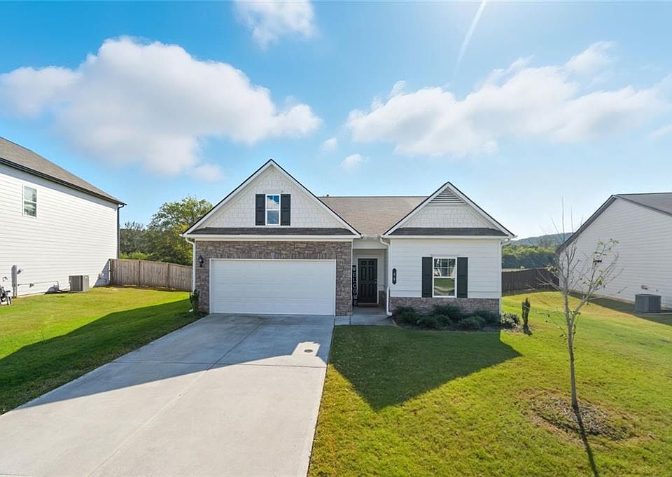 Welcome to 46 Jackson Farm Road, a thoughtfully upgraded 3-bedroom, 2-bath ranch offering effortless, single-level living just minutes from downtown Cartersville. This home features a bright, open layout filled with natural light, a gas kitchen with an oversized island, black granite countertops, sleek black appliances, and modern pendant lighting. Luxury EVP flooring runs throughout the home, enhancing both style and durability. The generously sized primary suite includes a tiled walk-in shower, dual vanities, excellent storage, and a convenient pass-through from the primary closet to the laundry room, adding everyday functionality. The secondary bathroom features upgraded finishes, setting this home apart from traditional builder-grade options. Outdoor living is enhanced by a private patio with a gas grill hookup, ideal for easy entertaining. Additional upgrades include ceiling fan wiring throughout, upgraded blinds, Cat 5 wiring, and the opportunity to add an additional bedroom above the garage. With no remaining builder lots in the Jackson Farm community, this like-new home presents a rare opportunity. Schedule your showing today.