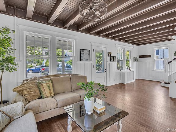 Nestled in the heart of Huntington Village, this 1914 Victorian home exudes timeless charm. Step onto the beautiful front porch, a welcoming space that hints at the character from within. Inside, the generous high ceilings create an airy grandeur, the eye drawn upwards to exposed beams that speak to the home's solid history. Large, ornate windows that flood the rooms with natural light, illuminating the rich dark woodwork of the ceiling. Below, the walls are adorned with elegant wainscoting featuring raised panels, adding a layer of architectural detail and sophistication that complements the home's vintage charm. The welcoming eat-in-kitchen serves as the heart of the home, a warm and inviting space perfect for everyday meals and gatherings. Upstairs, discover three light and airy bedrooms, each a tranquil retreat where sunlight streams through windows framed by crown moldings, further enhancing the home's classic appeal. The full bathroom is a step back in time, featuring a beautiful pedestal tub that invites relaxation. The landscaped backyard offers privacy and creates an intimate atmosphere while either enjoying the sun-filled deck or dining under the pergola. This lovely, updated home seamlessly blends its original character with modern comfort. Full walk-out basement with high ceilings. Carriage house with storage on the main level and a full basement for additional storage. Offers a substantial and versatile space. Home has gas heat, cooking and sewer. Located steps away from Main Street in Huntington, which gives residents access to a vibrant scene of world-class restaurants, lively bars and exciting nightlife. Close to LIRR.
