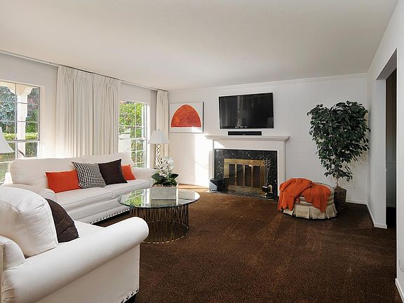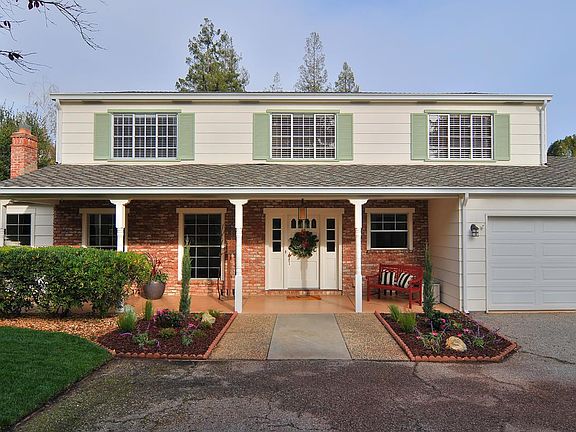 Traditional home one block to the Village! Classic exterior with brick-clad walls, window shutters and covered porch. Spacious formal living room with tall, front-facing windows for natural light, and glass-enclosed fireplace. Formal dining room with access to the rear yard. Eat-in kitchen with fine wood cabinetry topped with tile counters, stone-like vinyl flooring and large casual dining area. Inviting family room with glass-enclosed fireplace flanked by bookshelves and sliding glass doors to the covered patio and rear yard. Main-level bedroom perfect for an office or guest with direct access to the hall bathroom - can be closed off to create separate unit. Large upstairs master suite with walk-in closet and updated bathroom. Spacious and private rear yard with newly planted lawn, large partially covered patio for outdoor living, and apple and orange trees. Attached 3-car garage. Excellent downtown location just one block to shopping & dining. Top-rated Los Altos schools!
