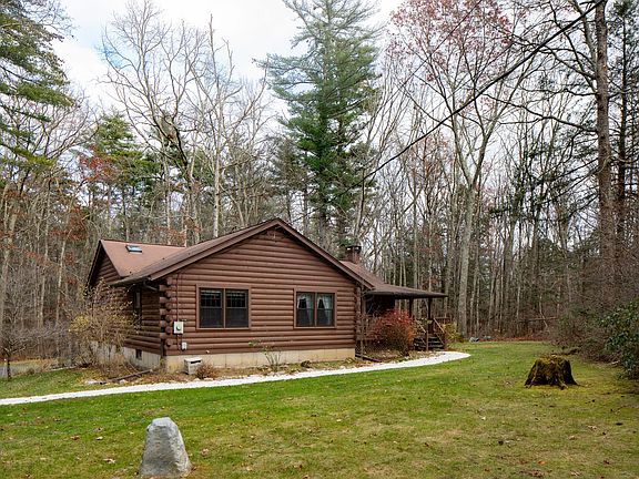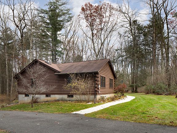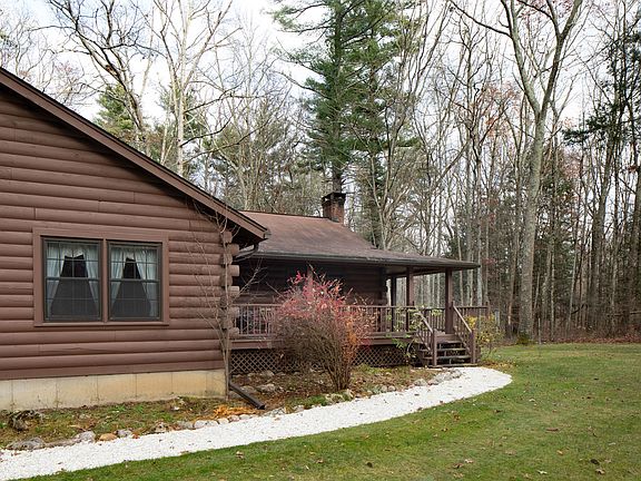 Welcome to this inviting log cabin set on 7 peaceful acres in a highly desirable location. Warm pine accents carry throughout the home, enhancing its rustic charm and comfortable atmosphere. The spacious open living and dining area features a striking cathedral ceiling, a fireplace with a woodstove insert, and dual sliding doors that extend to a wrap-around covered porch-perfect for enjoying the surrounding natural beauty in any season. The kitchen offers excellent counterspace and a bright skylight that fills the room with natural light. This home provides abundant storage and a well-designed layout, offering two bedrooms and a full bath in addition to a generous primary suite. The suite includes a large walk-in closet, a convenient laundry area, a second full bath, and a nicely sized bedroom. The lower level adds even more versatility with a large finished room ideal for play, entertainment, or hobbies. Additional features include a two-car garage under the home, a separate storage room, and a well-appointed workshop with double steel doors providing easy access from the garage. A paved driveway completes the property. Embrace the privacy, space, and character this exceptional log cabin has to offer. All room sizes are approximate.