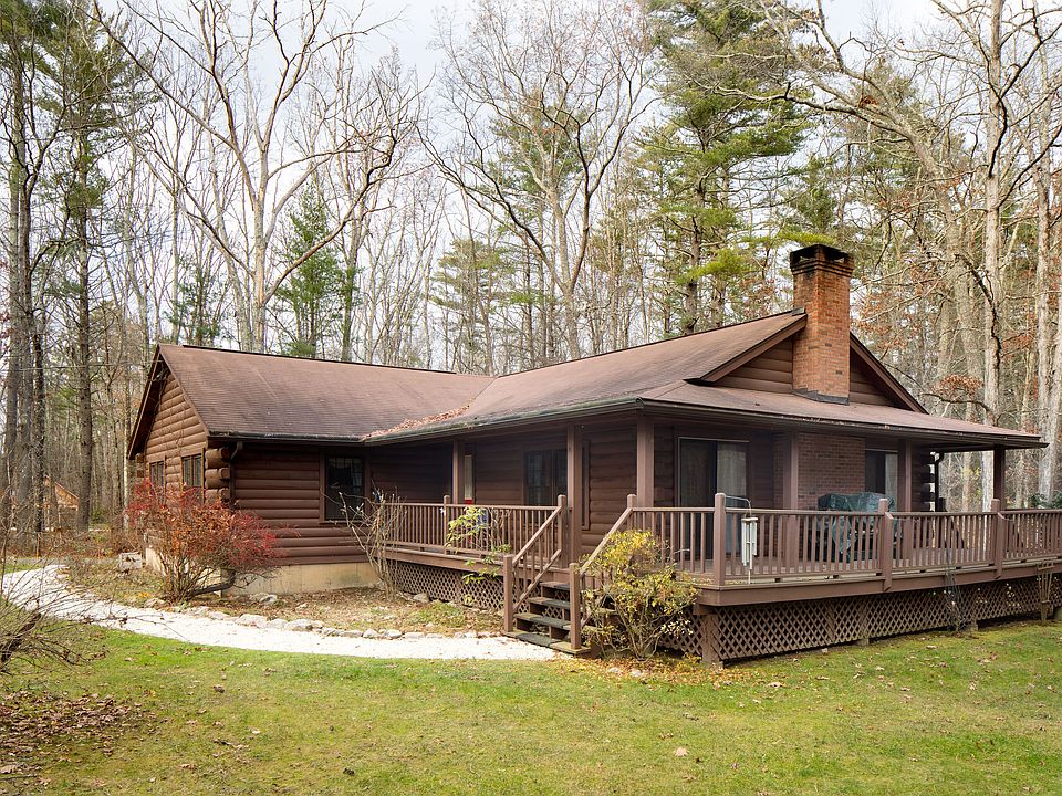 Wrap-around covered porchRustic charmSurrounding natural beautyInviting log cabinPaved drivewayWarm pine accentsBright skylight
