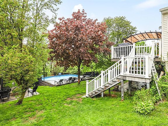 Step outside to your personal backyard oasis: through Pella doors, a gorgeous Trex deck opens to multiple brand-new stone patios—one with a stylish pergola and fire pit, perfect for entertaining. The sparkling swimming pool is surrounded by lush landscaping, flowering trees, and vibrant plantings, making this yard a true showpiece from spring through fall.