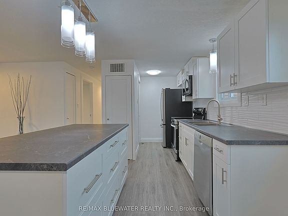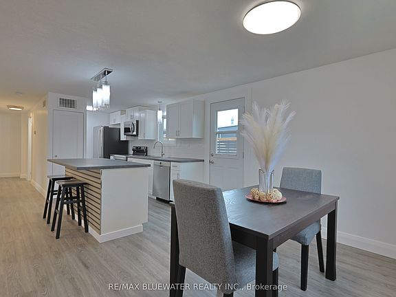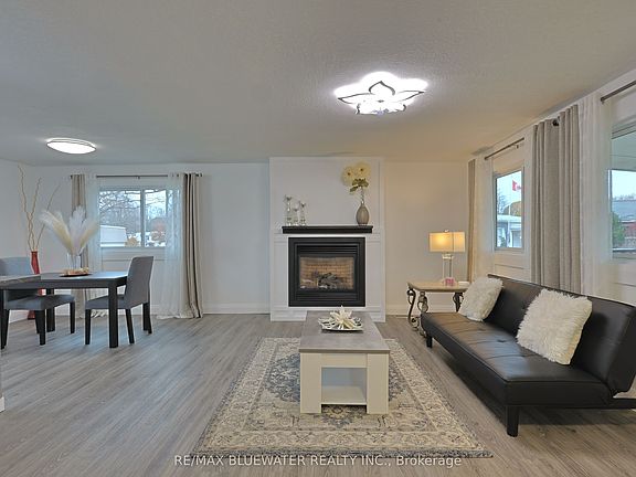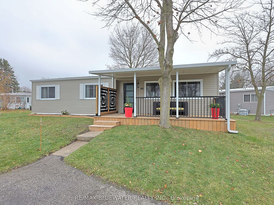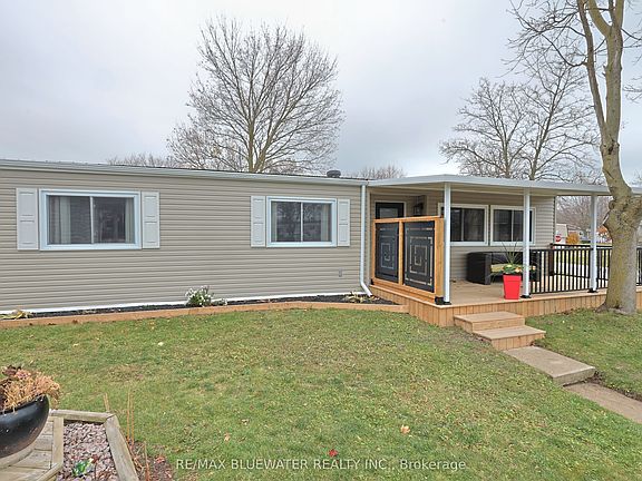 FULLY UPDATED IN 2024 FOR UNDER $300K! Welcome to 46 St Andrews Pl, Grand Bend where you find an incredible blend of updates and value in Grand Cove Estates. Updated exterior with vinyl siding, vinyl windows, doors, metal roof, decks, privacy fences and more. Spacious 20'x8' front covered porch leads you inside to your fully updated home. Interior floorplan was changed to allow for open concept living area with lots of windows for natural light. Luxury vinyl plank flooring throughout the home. Living room features a gas fireplace with surround. Kitchen offers eat-up island, new appliances, tiled backsplash, lots of counter space, food pantry & more. Dining area off of kitchen with door to back deck for quick access to the BBQ. Primary bedroom with walk-through closet, that is outfitted with stackable laundry machines, leading to the two piece ensuite. Floorplan allows for another bedroom and main full three piece bathroom with tiled shower. 16'x7' back deck off of kitchen with privacy fence offers more space to relax! Grand Cove Estates is a 55+ land lease community located in the heart of Grand Bend. Grand Cove has activities for everybody from the heated saltwater pool, tennis courts, woodworking shop, garden plots, lawn bowling, dog park, green space, nature trails and so much more. All this and you are only a short walk to downtown Grand Bend and the sandy beaches of Lake Huron with the world-famous sunsets. Monthly land lease fee of $869.39 includes land lease, access to all amenities and taxes.