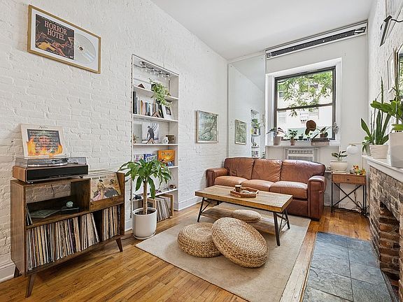 Exposed brick wallsSleek light fixturesBuilt-in bookshelvesEasy walk-upWood-burning fireplaceHardwood floorsRenovated windowed bathroom