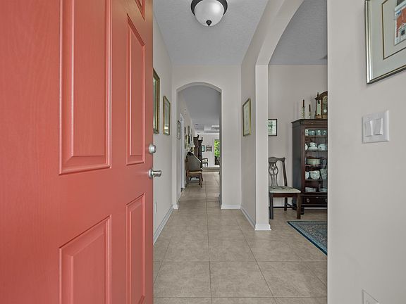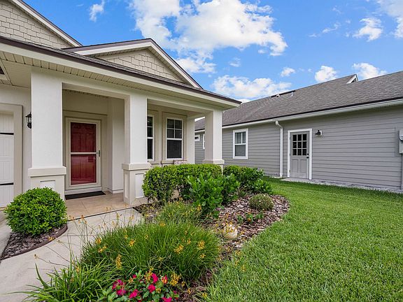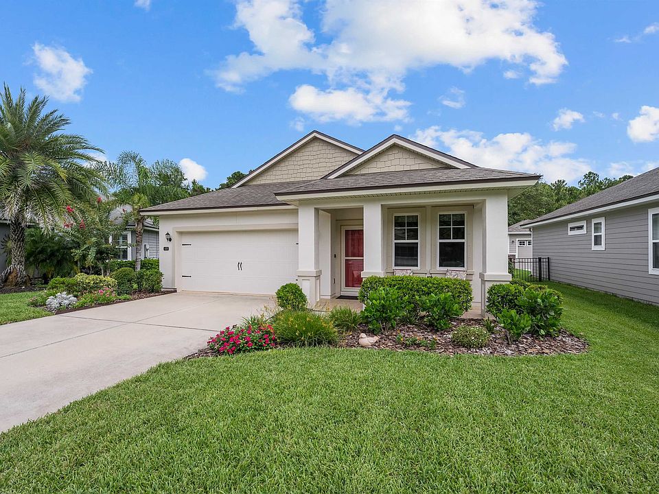 Discover this beautifully maintained three-bedroom, two-bath home tucked away on a quiet cul-de-sac, offering peaceful water views and an inviting outdoor living space. Designed with an open-concept layout and filled with upgrades, this move-in ready residence combines style, comfort, and low-maintenance living. The well-appointed kitchen features granite countertops, custom cabinetry, stainless steel appliances, recessed and pendant lighting, a separate pantry, and a raised breakfast bar overlooking the dining area. The adjacent great room is bright and airy with trey ceilings, a double window, ceiling fans, and a sliding glass door that leads to the screened, tiled porch where you can relax and enjoy the serene water views. The private primary suite, located in its own wing of the home, boasts backyard views, a walk-in closet, and a luxurious bath with dual vanity, upgraded tile flooring, and a sunlit shower. Two additional oversized bedrooms and a beautifully upgraded guest bath provide comfort for family and guests, while a versatile bonus room can serve as an office or second dining area. A separate laundry room, attic storage, and a two-car garage with extended parking further enhance the home’s functionality. Outdoor living is equally inviting with a covered front porch, screened porch, extended paver patio, upgraded landscaping, and a fenced backyard offering shade and privacy. Additional features include a newly painted exterior, hurricane shutters, ceiling fans throughout, ceramic tile flooring, plush carpet in the bedrooms, and ample storage. Nestled within the desirable Villages of Valencia, residents enjoy a sparkling community pool, volleyball court, BBQ grills, and the benefit of no CDD fees. Surrounded by nature with easy access to the Matanzas River and Intracoastal Waterway, this community offers activities and amenities for every lifestyle. Don’t miss your chance to call this stunning home yours—schedule your private tour today!
