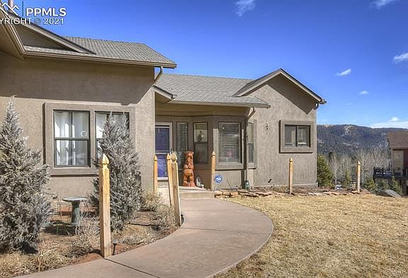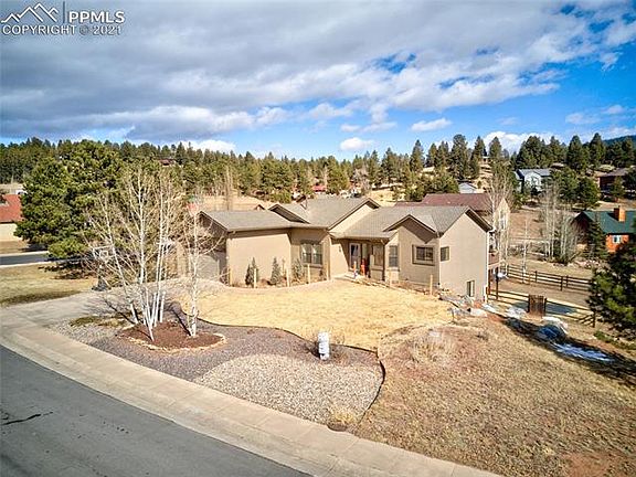 Gorgeous ranch style home in the area of Gray Horse Ranch in Woodland Park with lower level walk-out and beautiful Front Range views. This 4 bedroom, 3 bath, 2-car garage home is situated on a large corner lot that features spruce trees, wildflower beds, an expansive 2-level composite reinforced Trex deck for a hot tub and a in-ground trampoline. The focal point of the vaulted great room is the stacked rock gas fireplace with custom wood mantle and gleaming wood floors. The much desirable open floor plan features a vaulted gourmet kitchen with stainless steel appliances, granite countertops with eating bar and the attached dining room that walks-out to deck. The spacious master retreat features a 5-piece bath and a walk-in closet. Two additional bedrooms along with a full bath and the laundry complete the main level. The walk-out lower level includes a large family room with wet bar, a game area, a wonderful bonus/craft/fitness room with built-ins, an additional bedroom or office. Extras including newer main level high-end carpet with waterproof padding in 2020, wind rated storm door, lifetime rubber shingle roof, sod and irrigation system in front yard and all the amenities that Woodland Park has to offer.