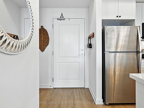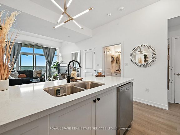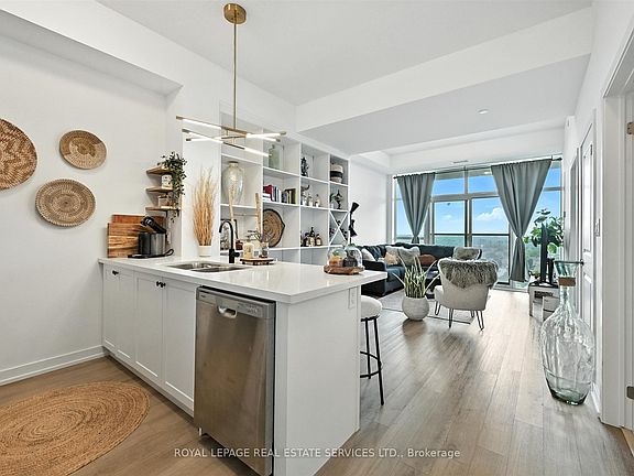 SOUGHT-AFTER PENTHOUSE IN TREND 2! This modern one bedroom, one bathroom suite offers stylish living with luxury vinyl plank flooring, floor-to-ceiling windows that fill the space with natural light, and energy-efficient geothermal heating and cooling. The bright living room features custom built-in display shelving and a Juliette balcony showcasing breathtaking views of the escarpment and the Town of Waterdown. The contemporary kitchen is designed with quartz countertops, subway tile backsplash, breakfast bar, and Whirlpool stainless steel appliances. Added conveniences include in-suite laundry, one outdoor surface parking space near entrance door, and a dedicated storage locker. The monthly condominium fee of $327.62 covers building insurance, common elements, heat, central air, and parking. Residents enjoy access to an array of resort-style amenities, including a concierge, fully-equipped fitness centre, party room with full kitchen, a rooftop patio with community BBQs perfect for entertaining or relaxing, bike storage, and visitor parking. Set in the heart of Waterdown, this location is a dream for nature lovers, surrounded by greenspace, hiking trails, and bike paths, while also offering easy access to parks, dining, trendy cafes, shopping, public transit, Aldershot GO Station, major highways, and everyday essentials. Perfect for first-time buyers, downsizers, or investors, this penthouse seamlessly combines comfort, lifestyle, and connectivity - an exceptional opportunity in a vibrant community.