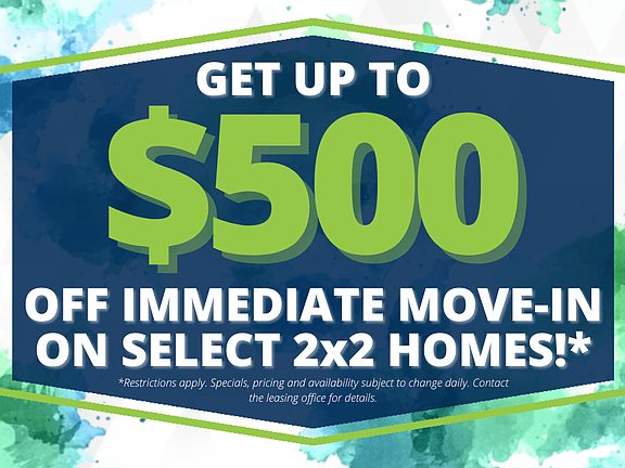 - Special offer! Get up to $500 off immediate move-ins on select 2x2 homes! *Restrictions apply. Specials, pricing and availability subject to change daily. Contact the leasing office for details.