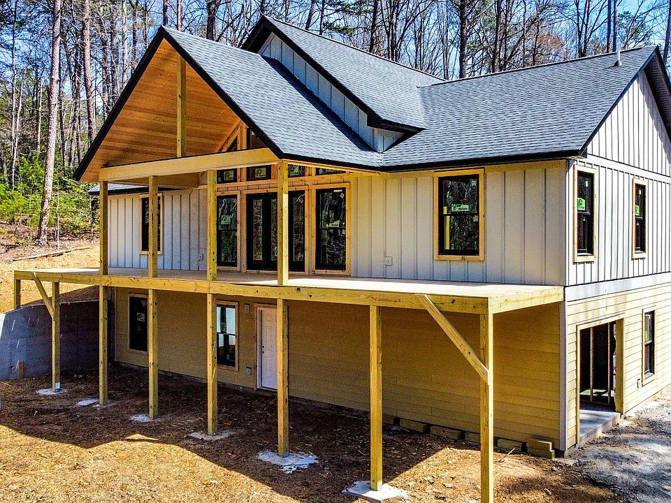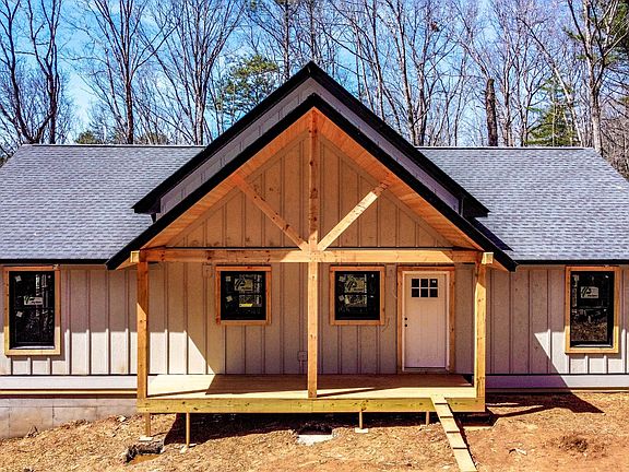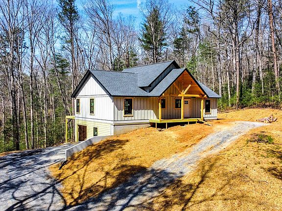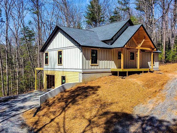 Introducing this stunning almost completed new construction with the appeal of rustic as well as timeless traditional finishes and a practical and spacious layout. Bright open floor plan with captivating tongue and groove vaulted ceiling and stone fireplace. Extensive display of windows with upgraded aluminum clad exterior and wood interior from floor to ceiling. Quartz kitchen counters and island with stainless appliances. Two spacious bedrooms on the main level w/ large bathrooms and carefully selected and designed tile showers and quartz counters. Covered back deck for entertaining with vaulted tongue and groove ceilings overlooking the private wooded lot and fire pit area, with the gentle sounds of the creek across the road from the property. Sizable 1 car garage and full basement stubbed for bathroom, 2 bedrooms, and a large living area. This home is ideal for enjoying the North Georgia Mountains and an extensive list of amenities. Completion will be mid May.