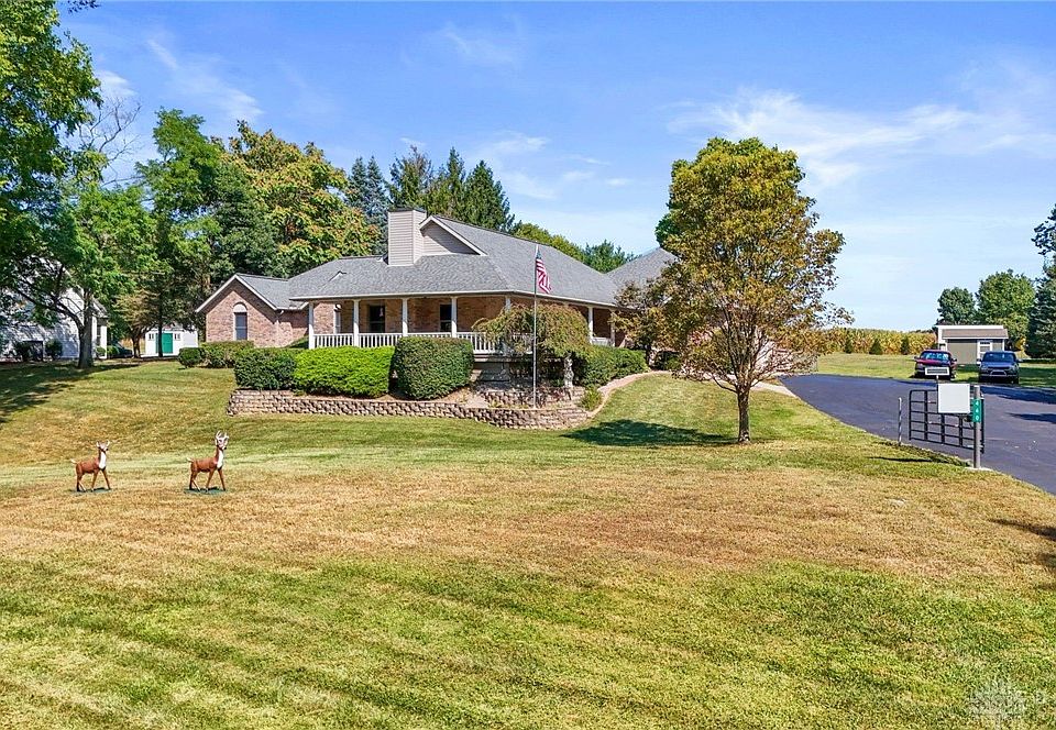 Welcome to this beautifully maintained brick ranch in Xenia, offering the perfect blend of space, craftsmanship, and modern comfort. Situated on two parcels totaling just under 1.5 acres, this property provides a serene setting with mature trees, manicured landscaping, and a sense of privacy rarely found so close to town. A long, paved driveway leads you to a new solar-powered entry gate (installed 2024) and an attached three-car heated garage with a new furnace. The inviting wrap-around covered front porch sets the tone for relaxed country living with timeless curb appeal. Inside, you’ll find an open and inviting layout accented by rich hardwood floors throughout the entry, kitchen, dining area, and hallway. The spacious living room features vaulted ceilings, plush new carpet (2023), and abundant natural light from multiple windows, creating a warm and welcoming gathering space. The kitchen offers generous cabinetry with custom wood finishes, updated stainless-steel appliances that convey, and a functional layout ideal for cooking and entertaining. Just steps away, the dining area provides seamless flow for everyday meals or hosting family gatherings. All three bedrooms are comfortably sized and carpeted, with solid six-panel wood doors and custom wood blinds adding a refined touch. The primary suite impresses with its vaulted ceiling, walk-in closet, and spa-like en suite bathroom featuring a dual-sink vanity, Jacuzzi soaking tub, and separate stand-up shower. The semi-finished basement expands your living options with a recreation area, dedicated tornado shelter/safe room, and ample storage. Outdoor living is equally inviting with a newly added gazebo, perfect for entertaining. Recent updates include: Solar-powered driveway gate (2024), New carpet (2023), Garage furnace (2023), Interior painting (2023), 12x16 gazebo addition.This exceptional property combines comfort, safety, and timeless design—ready to welcome its next owner to years of enjoyment.