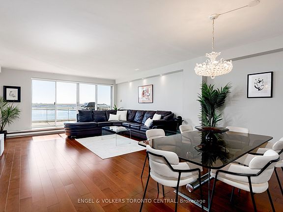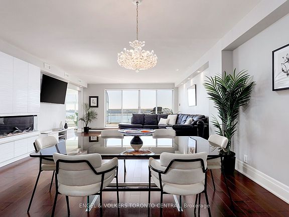 This rare two-bedroom, two-bathroom home offers approximately 1,800 sq. ft. of elegant living space with sweeping, unobstructed views of Lake Ontario and Toronto's waterfront. Beautifully south-facing, every room captures breathtaking vistas of open water and sky. The spacious principal rooms flow seamlessly to a large walk-out terrace with multiple access points and uninterrupted lake and island views. The newly designed kitchen features premium Miele appliances, a waterfall centre island, and refined custom cabinetry. The primary suite includes a luxurious five-piece marble ensuite and a walk-in closet with solid walnut built-ins, while the second bedroom offers atrium-style windows, a built-in Murphy bed and office space, and terrace access. Solid oak floors, custom wood doors, pot lighting, a built-in entertainment unit with fireplace, ample storage, and a large locker complete this exceptional residence.